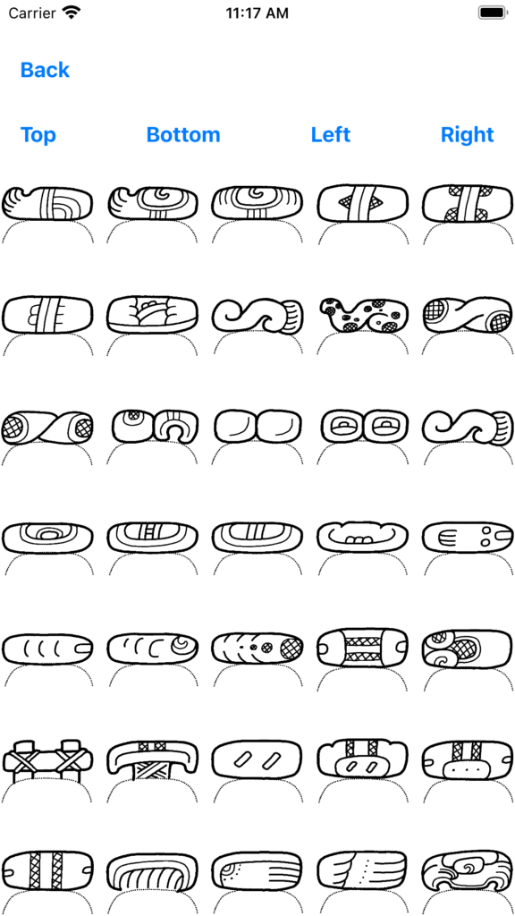 For those especially interested in decoding glyphs blocks, here’s some bonus material on affixes/prefix symbols. Most affixes can appear on any side of a main glyph (the top, bottom, left or right). When decoding a glyph block you typically must find for a specific affix glyph from a list in a printed catalog. Naturally, the catalog only prints the glyphs with in one rotation. If glyph you’re looking for isn’t in that rotation, your job is a little harder. If you’re new to reading these glyphs, perhaps more than a little harder. To complicate this even more, some affix glyphs are not rotatable. These glyphs only appear in a single orientation. Some glyphs are only top, some only bottom, some only left and at least one only left or right. With the Ancient Maya App you don’t worry about any of this. From the Decode Text home, when you click on Affix you get the affix glyphs. There are also button across the top to select orientation. The default orientation for affix glyphs is “Top”, it displays all rotatable glyphs as top glyphs as well as all non-rotatable glyphs that have a top orientation. If you’re looking for a left, right or bottom affix glyph just hit the desired orientation button and all the relevant glyphs are displayed in the proper orientation. Yay!