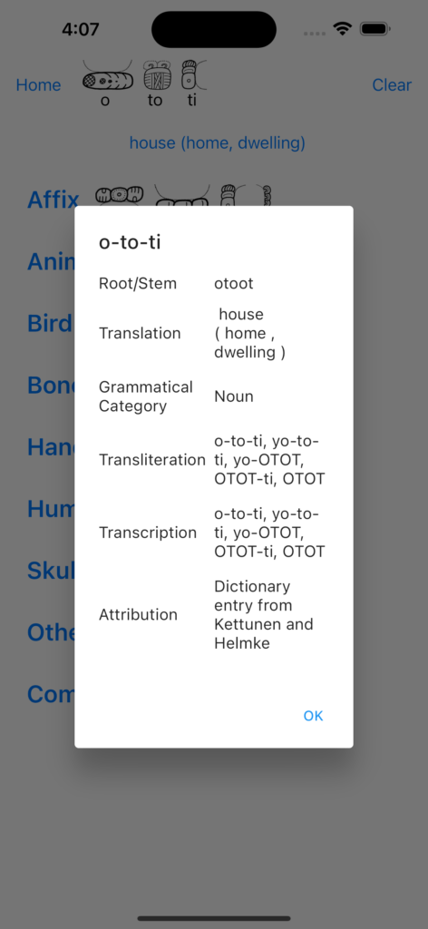 The dictionary is integrated into the Decode Glyph Block feature. Each time the user identifies an individual the glyphs image and its definition is displayed at the top of the screen. The app automatically searches for a matching in the transliteration field of the dictionary. Here’s a screenshot showing the feature. The user identified three individual glyphs from a glyph block. Combined, these glyphs record the sounds “o-to-ti”. Notice that the app displayed the English translation (or more technically, the gloss) as “house (home, dwelling)”.