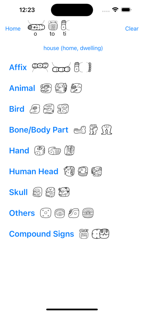 As with any new feature, there are some limitation. You can’t yet scroll through dictionary entries or search them. That would be useful and it will be in a future release of the app. Currently the app only includes the phonetic dictionary entries. It lacks the logograms from 79 to 87 of Introduction to Maya Hieroglyphs. Again, that would be useful and it will be in a future release.